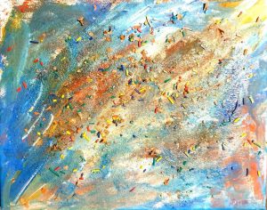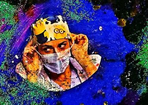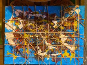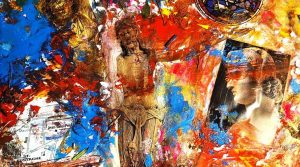در کارهای کلاژ، ترکیببندی و چیدمان عناصر بصری، در پسزمینهی رنگی، متنوع جذاب و غافلگیرکنندهاند: زنانی که لابد در زمان پاندمی کووید ماسک زدهاند، مردان و زنانی که عکسهایشان روی تابلوها آمده و هر کدام به سویی مینگرند، انسانهای افریقایی که رنگ پوستشان در امتداد طیف رنگ زمینه است یا تابلویی که با طناب دورادور پیچیده شدهاش، یک زندان سیاسی انتزاعی را تداعی میکند. همچنین، استفاده از مواد و تکههای عکس و پارچه و تراشه در کارهای دیگر، از جستجوهای نوآورانهی نقاش و آمیختگی زبانی پیچیده با نظرگاههای زایش انسانشناختی و گاه نگرههای فرگشتی گواهی دارد.